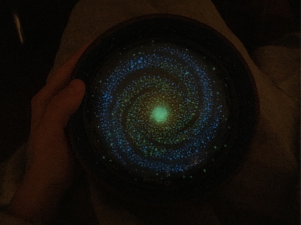 这是一副碗中画。由水晶胶和荧光颜料绘制而成。其中水晶胶和荧光颜料各七层,是一副简单的银河系四臂图。右上角是我的英文名,印在了最上一层封层所用的水晶胶下。在吸收了阳光或者灯光后,黑暗中它就是这个样子= ̄ω ̄=
